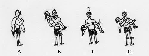 The most dignified carry is the Over-The-Threshold (Figure B). I mean, if it’s good enough for wedding photos… But when I went to try this (left arm under the upper legs, right arm behind the neck and shoulder blades), the person just slipped through my arms. By moving my right arm down to the upper back, I could perform the lift, but the person’s head and arms just flopped over backwards (Figure C). That’s not what happens in the movies! Then I realized in the movies, she is only feigning unconsciousness and is really using an arm to support herself (Figure D). In real life, if you’re careful enough, you can get your neck under her armpit and balance her torso with your upper arm, but her head will still flop over backwards. It’s not as easy as it looks.